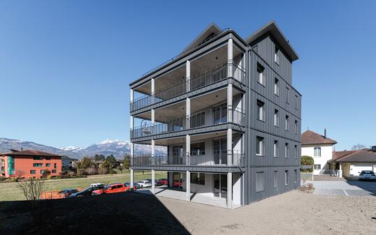 Eingangs Schaan ist ein neues Mehrfamilienhaus entstanden, vertikal organisiert, es erscheint fast wie ein Turm.