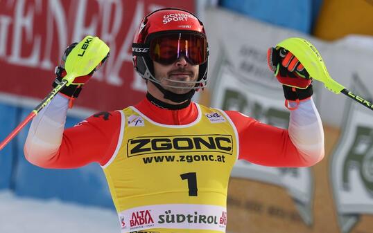 Nach seinem Podestplatz am Wochenende doppelt Loïc Meillard nach und holt sich beim Slalom in Alta Badia den dritten Rang.