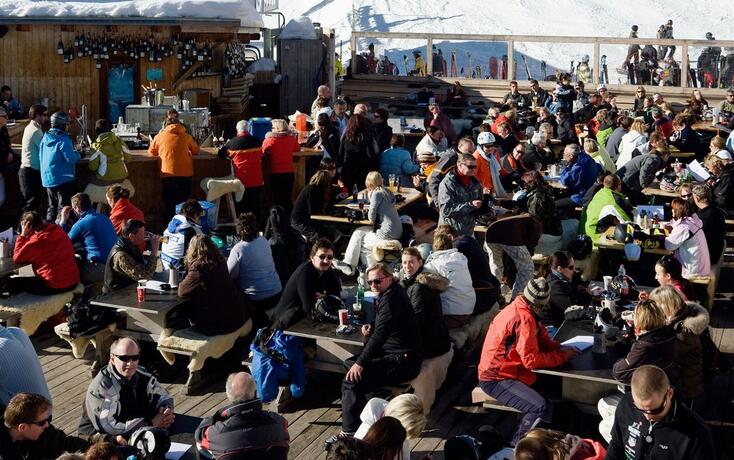 An schönen Tagen ist es in beliebten Skigebieten schwierig, einen Platz für das Mittagessen zu finden.