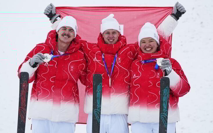 Die Schweizer Skiakrobaten Pirmin Werner, Noé Roth und Lina Kozomara gewinnen Silber im Mixed Aerials. Nun folgt die Party.