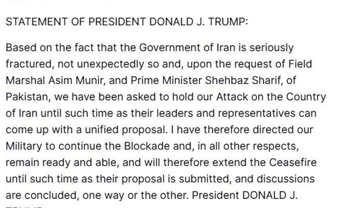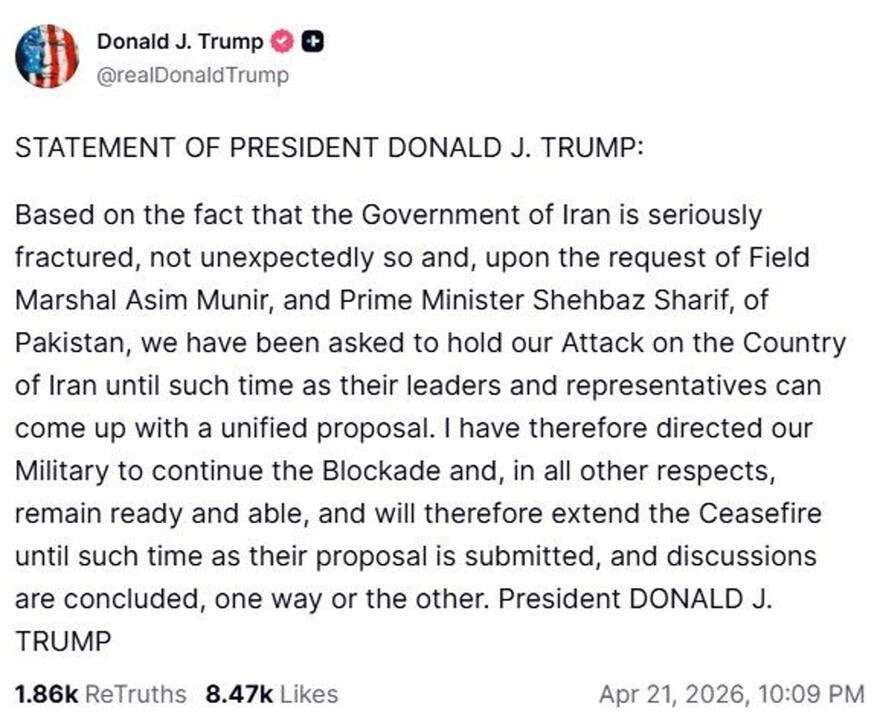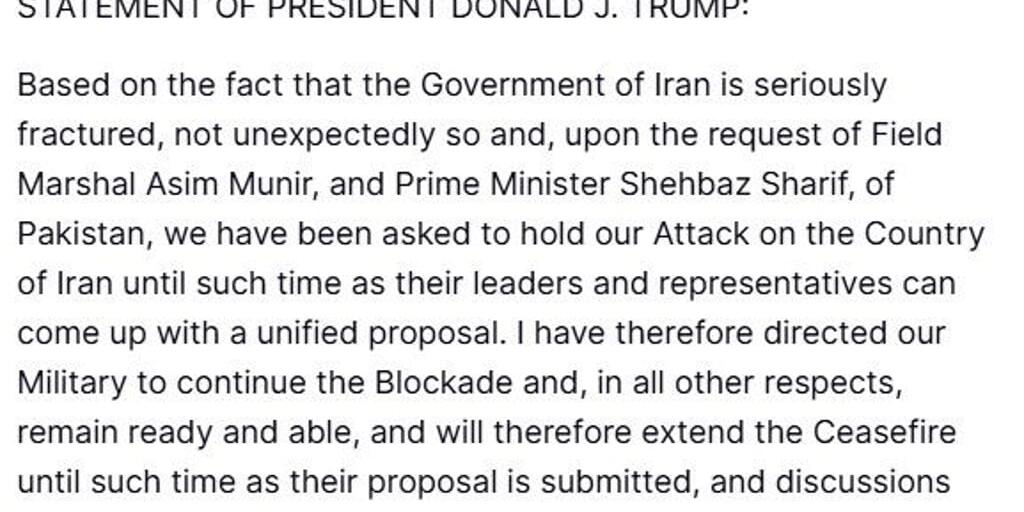 Trump hatte während der seit dem 8. April geltenden Waffenruhe wiederholt erklärt, sein Team verhandle mit iranischen Vertretern, die auf ein Abkommen drängten. Zugleich räumte er ein, dass seine Entscheidung, mehrere führende Köpfe der iranischen Regierung zu töten, gewisse Komplikationen mit sich gebracht habe.