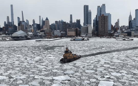 Nach dem verheerenden Wintersturm in den USA bleiben die Temperaturen in der Metropole New York weiterhin bitterkalt. Wegen vieler Eisschollen auf dem Hudson und East River musste der Schiffsverkehr auf den beiden Flüssen weitgehend eingestellt werden.
