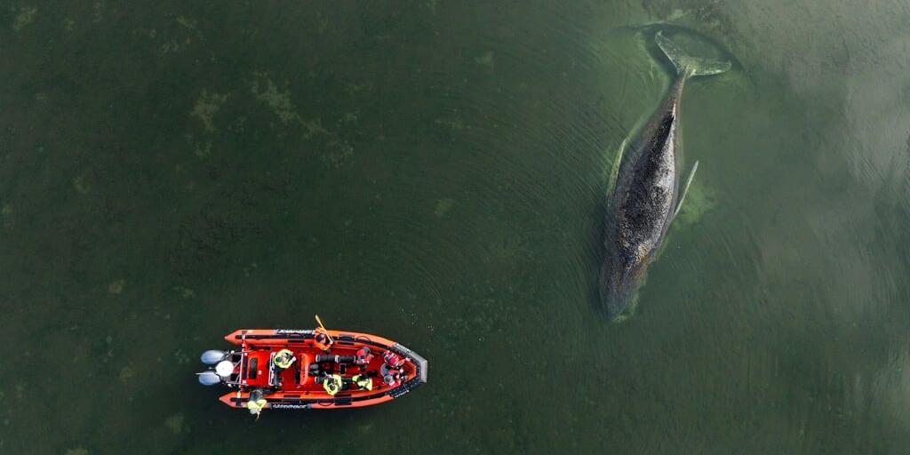 Begleitet von Greenpeace: Der gestrandeten Buckelwal vor der Insel Poel in der Ostsee am 1. April