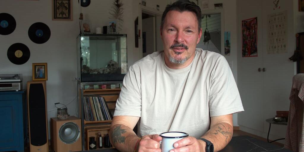 David Heiderich trinkt Tee am Wohnzimmertisch seiner Wohnung in Hünenberg.