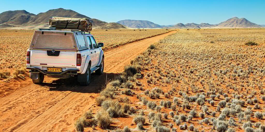 Ein Pick-up fährt durch eine Wüste Namibias, das soll bald auch elektrisch möglich sein.