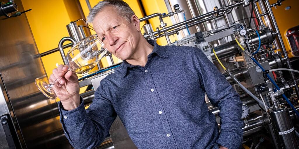 Winzer Marc Vicari vor der modernen italienischen Maschine, die Weine entalkoholisiert.