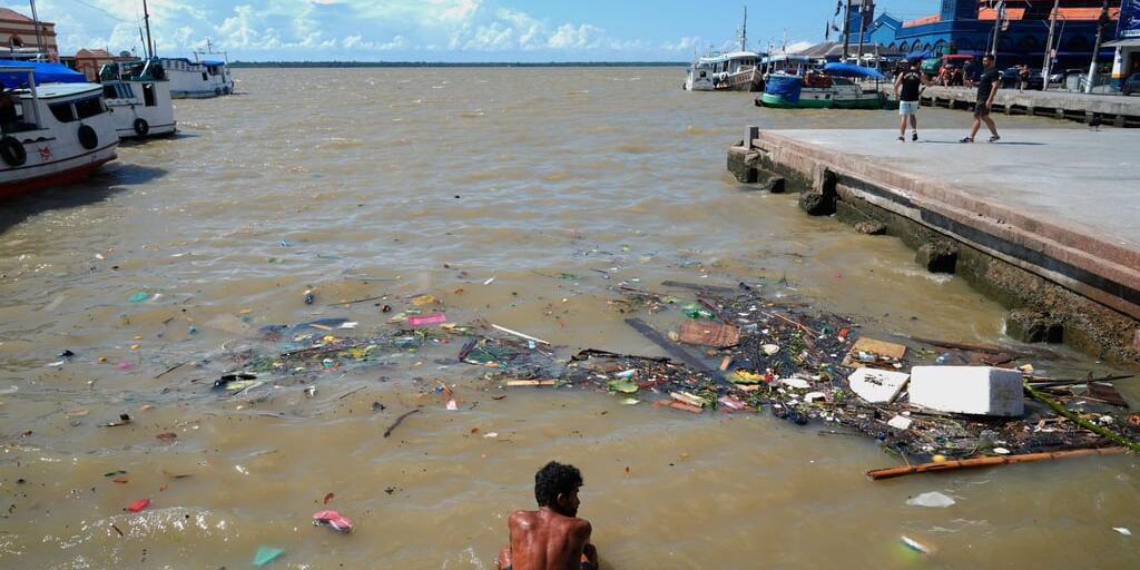 Ein Mann sitzt am Fluss an der Gegend des alten Hafens von Belém. Rechts oben in blau ist der Markt Ver-o-Peso, der vor über 100 Jahren zur wirtschaftlichen Blütezeit wegen des Kautschukexports aus dem Ausland eingeschifft wurde.