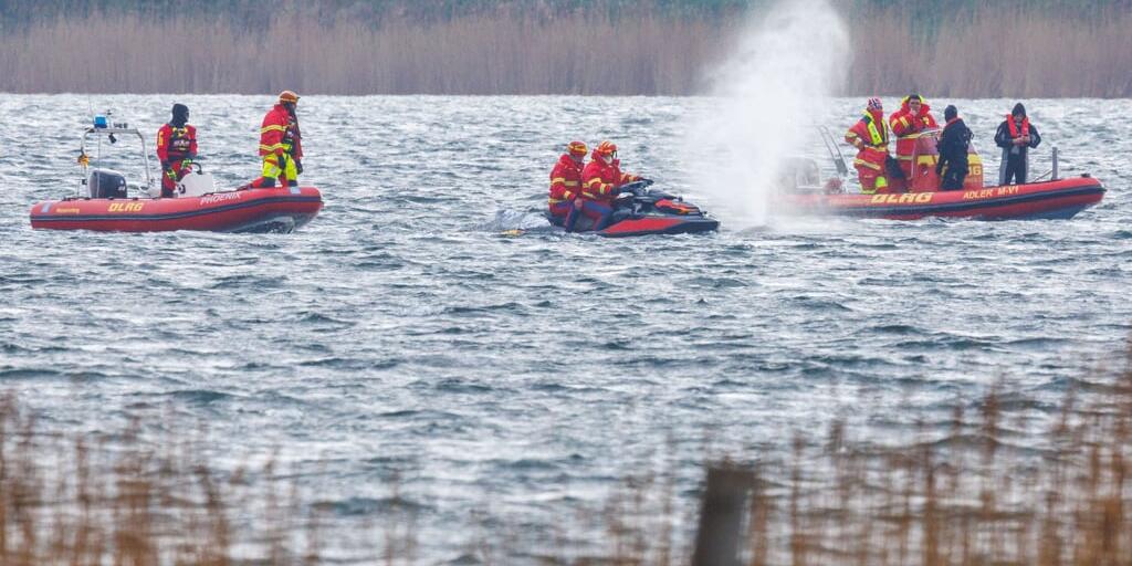 Der Buckelwal vor der Insel Poel schwimmt frei und wird von Helfern in Schlauchbooten begleitet, die dem Wal die Richtung zum offenen Meer zeigen.