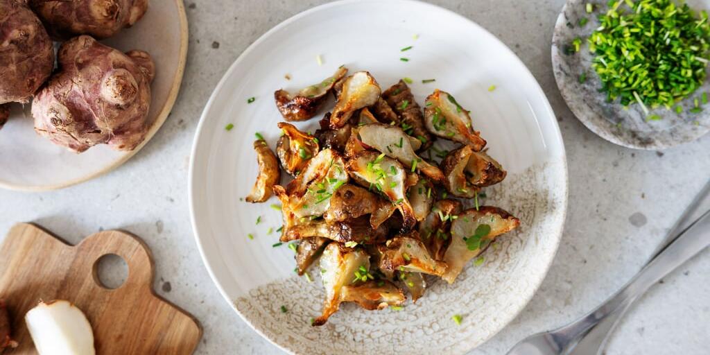 Im Ofen werden Topinambur-Scheiben besonders knusprig und sind ein gesunder, sättigender Snack.