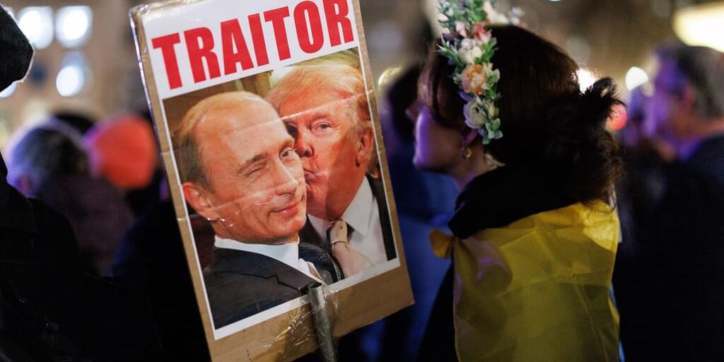Eine Ukraine-Unterstützerin zeigt in London auf ihrem Plakat, was viele denken: Donald Trump ist ein von Putin um den Finger gewickelter «Verräter».