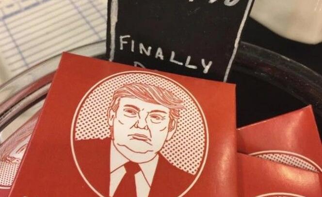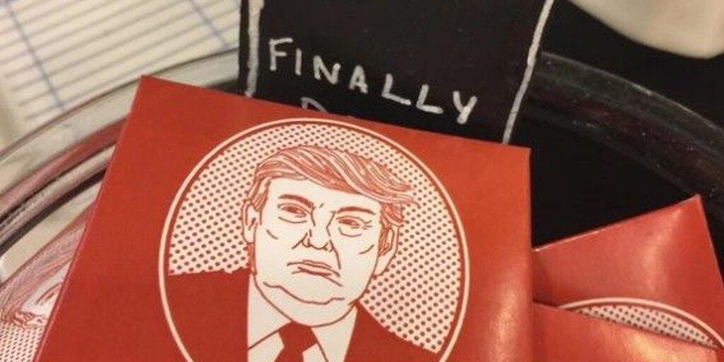 Ein weiteres Bild zeige eine Schüssel mit «Trump-Kondomen», die für 4,50 Dollar verkauft werden. Auf der parodistischen Verpackung werde der Redestil des Präsidenten verspottet: «Ich bin RIESIG!»