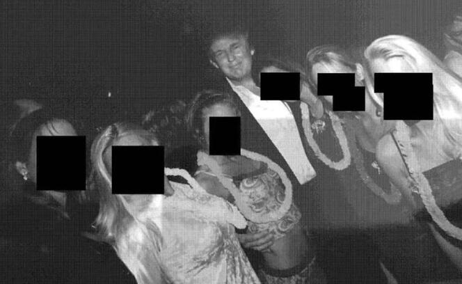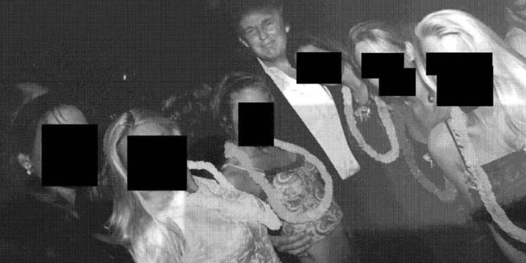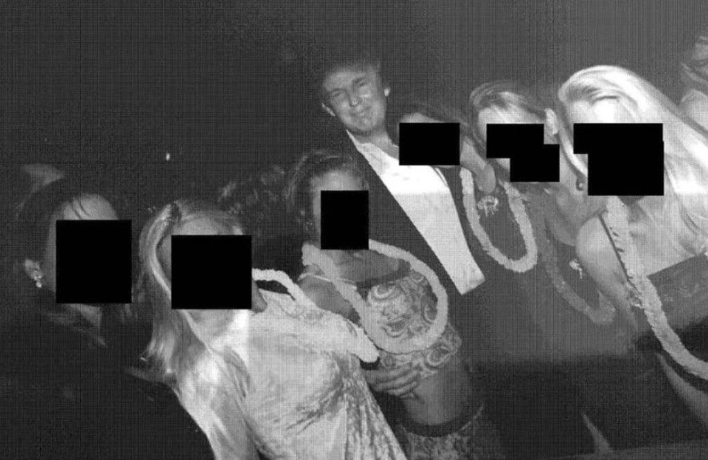 Auf einem Epstein-Foto ist Donald Trump zu sehen, umringt von Frauen, von denen einige Blumenkränze um den Hals tragen. Ihre Gesichter sind unkenntlich gemacht, doch der Präsident ist in der Mitte zu sehen und hält zwei der Frauen an der Taille.