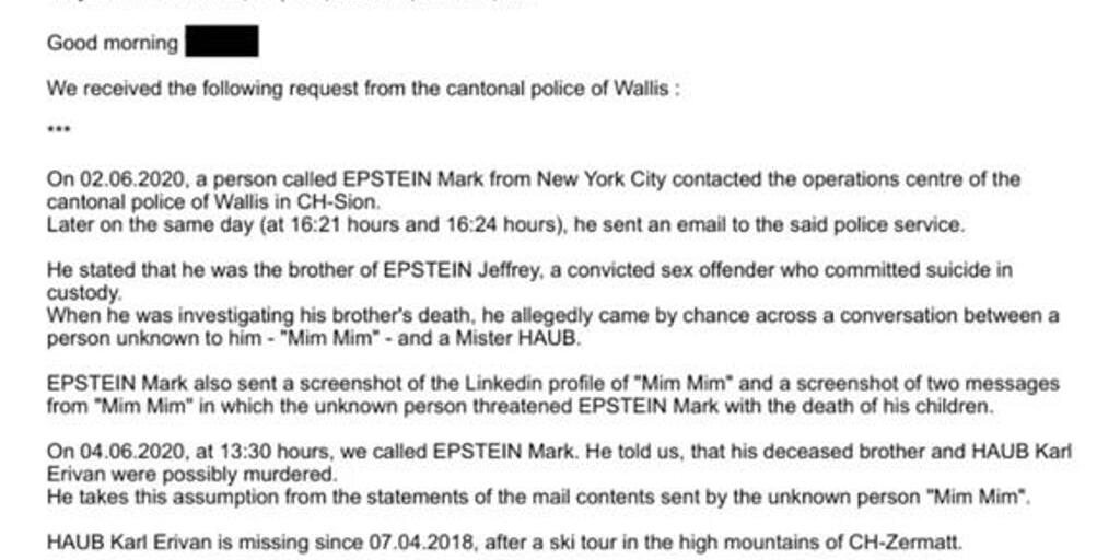 Mark Epstein äusserte gegenüber den Walliser Ermittlern schliesslich den Verdacht, sowohl sein Bruder Jeffrey Epstein als auch Karl-Erivan Haub könnten ermordet worden sein.