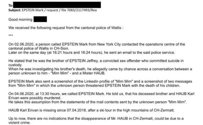 Ein bislang wenig bekanntes Kapitel spielte sich im Sommer 2020 ab, wie «blue News» berichtet. Damals meldete sich Mark Epstein, der Bruder des später tot aufgefundenen Jeffrey Epstein, bei der Kantonspolizei Wallis. Am 2. Juni rief er zunächst telefonisch in Sion an, noch am selben Tag folgten zwei E-Mails.