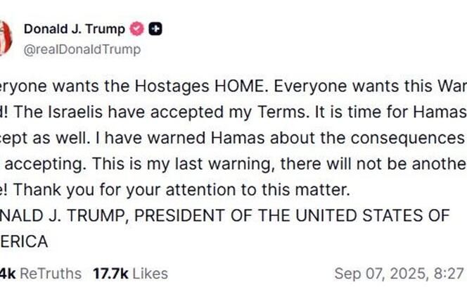 Trump drückt bei den Verhandlungen weiter aufs Tempo. «Mir wurde gesagt, dass die erste Phase diese Woche abgeschlossen sein sollte, und ich bitte alle, SICH ZU BEEILEN», schrieb der Republikaner auf der Plattform Truth Social. Es habe «sehr positive Gespräche» mit Hamas und anderen Ländern an diesem Wochenende gegeben, um die Geiseln freizulassen, den Krieg in Gaza zu beenden - aber vor allem, um den lang ersehnten FRIEDEN im Nahen Osten zu erreichen. Zuletzt sprach er erneut eine Drohung aus: Der Faktor Zeit sei von entscheidender Bedeutung - «SONST WIRD ES ZU MASSIVEM BLUTVERGIESSEN KOMMEN – ETWAS, DAS NIEMAND SEHEN MÖCHTE!»