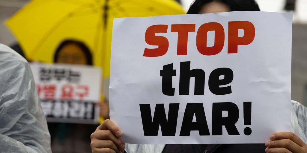 Diese Demonstranten in Südkorea drücken aus, wonach sich die Welt derzeit am meisten sehnt: einem baldigen Kriegsende im Nahen Osten.