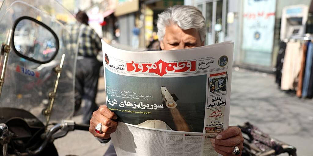 Ein Mann liest die Zeitung «Vatan-e Emrooz» mit der Schlagzeile «Überraschungen auf See» vor einem Kiosk in Teheran.