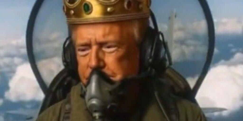 So sieht sich Donald Trump gerne: Als Kampfjet-Pilot mit falsch aufgesetzter Sauerstoffmaske und Krone. Das Bild stammt aus einem künstlich erzeugten Video.