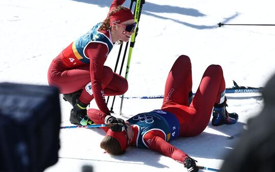 Mit diesem Konkurrenten haben die Langläuferinnen im olympischen Team-Sprint sicher nicht gerechnet: Auf der Schlussgeraden tauchte plötzlich ein Hund auf, der zusammen mit den Athletinnen ins Ziel rannte.
