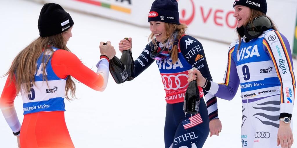 Gute Laune bei den Podest-Fahrerinnen in Spindlermühle: Camille Rast, Mikaela Shiffrin und Emma Aicher (von links).