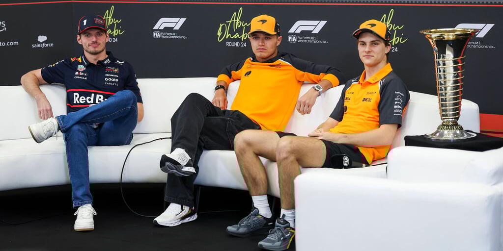 Max Verstappen (links), Lando Norris und Oscar Piastri (rechts) im Auge des WM-Pokals.