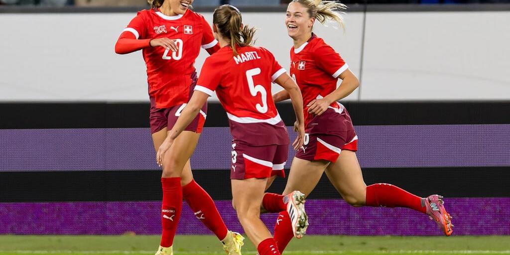 Torschützin Alayah Pilgrim (links) jubelt mit Noelle Maritz und Nadine Riesen.