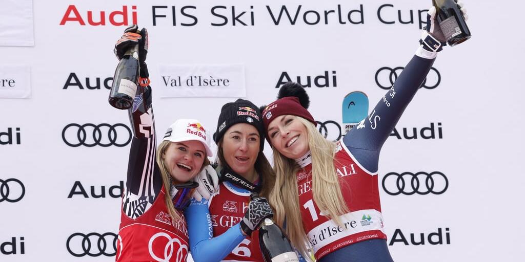 Das Podest des Super-G von Val d'Isère: Alice Robinson, Sofia Goggia und Lindsey Vonn (von links).