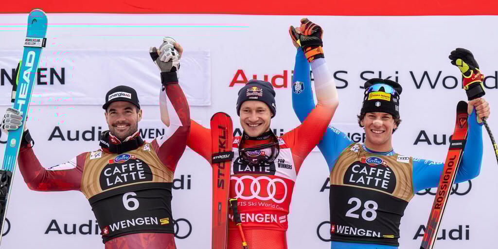 Das Podest der Lauberhorn-Abfahrt 2026: Sieger Marco Odermatt zwischen Vincent Kriechmayr (links, Rang 2) und Giovanni Franzoni (Rang 3).