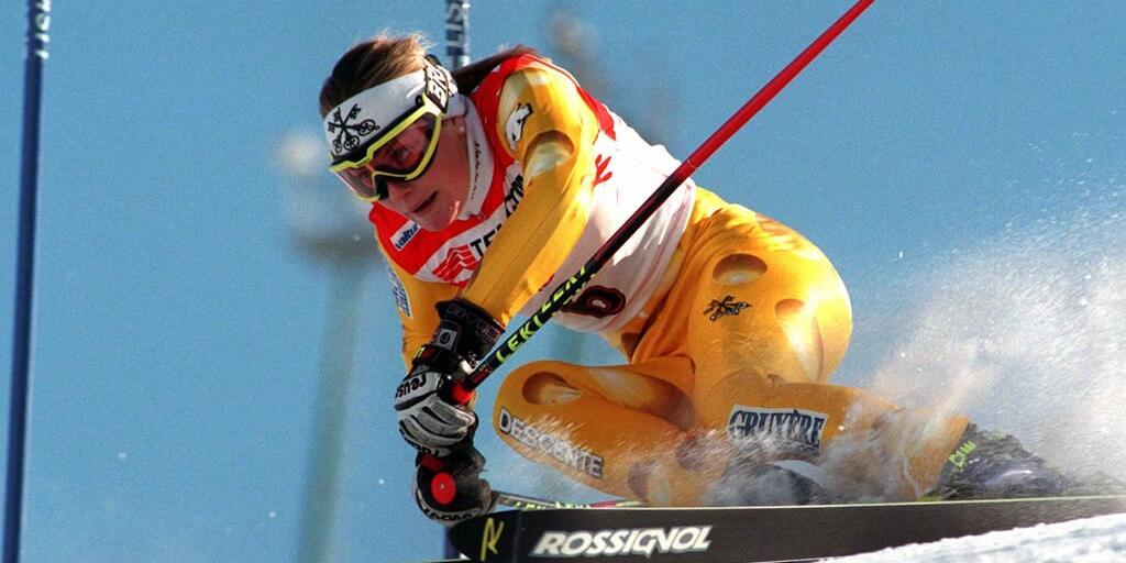 Karin Roten im Käsedress und ohne Helm: Das war in den 90er-Jahren in den technischen Disziplinen noch erlaubt.