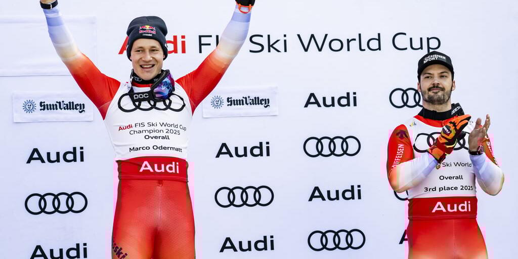 Bisher stand Marco Odermatt (links) Loïc Meillard im Gesamtweltcup jeweils vor der Sonne.