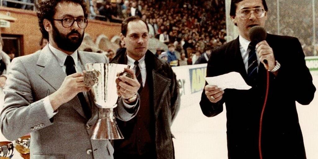 Das waren noch Zeiten: Siegerehrung für Team Canada 1985: links nach rechts: Davos Landammann Luzi Schmid (mit Bart), in der Mitte Herr Spengler, Sponsor (Modehaus Spengler, das gibt es nicht mehr) und rechts Putz Gfeller.
