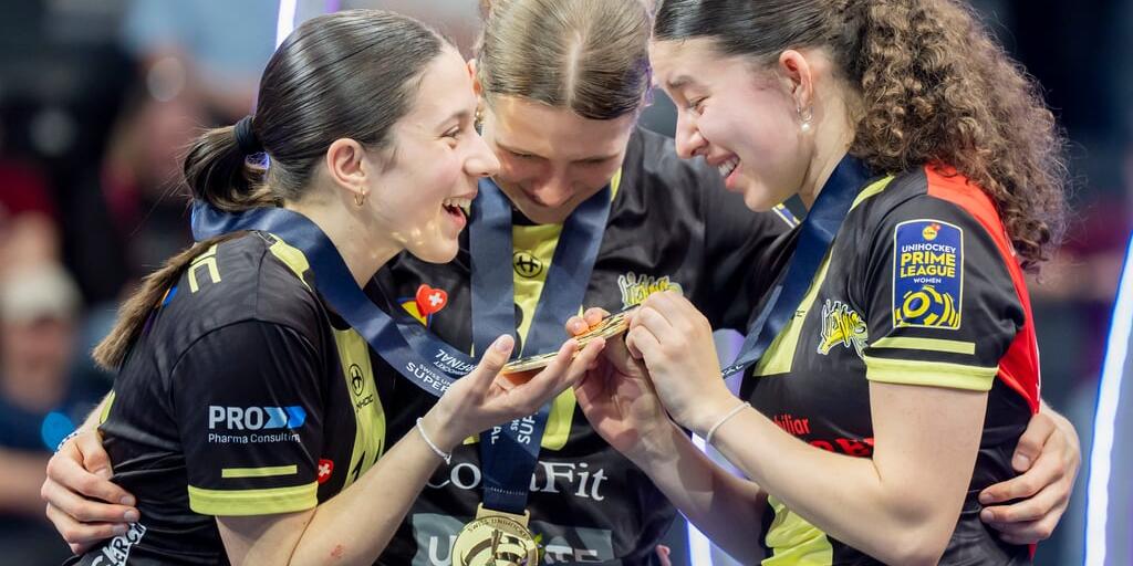 Larisa Müller, Lisa Von Arx und Dana Misteli (von links) strahlen mit ihren Goldmedaillen. (Freiburg, 25.04.2026)