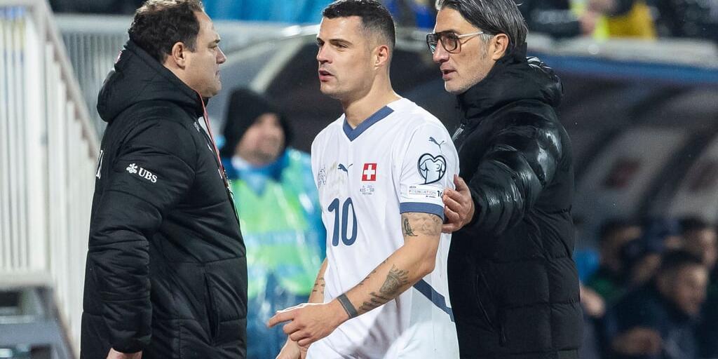 In der 75. Minute wird Granit Xhaka (Mitte) in Rücksprache mit Trainer Murat Yakin ausgewechselt.