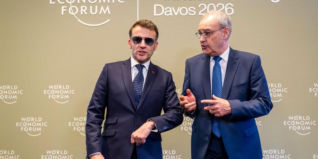 Frankreichs Präsident Emmanuel Macron (links) mit Sonnenbrille neben Bundespräsident Guy Parmelin.