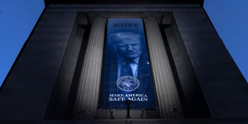Ein Banner mit dem Kopf von Präsident Trump hängt in dessen zweiten Amtszeit vor der Fassade des US-Justizdepartements.