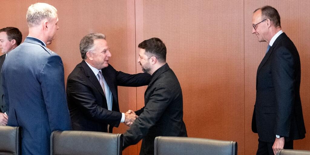 Schwierige Beziehung: Der amerikanische Sondergesandte Steve Witkoff (3. v. r.) und der ukrainische Präsident Wolodimir Selenski beim Handschlag im Berliner Kanzleramt; rechts der deutsche Kanzler Friedrich Merz.