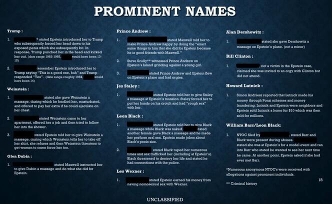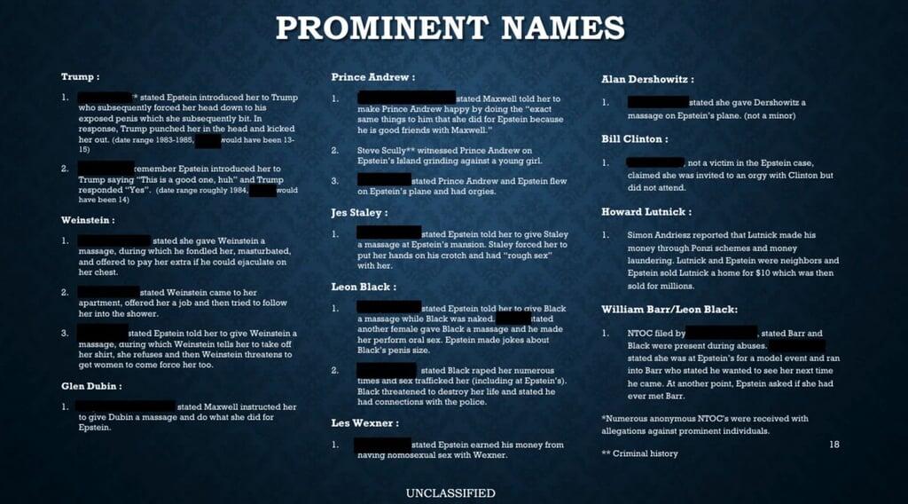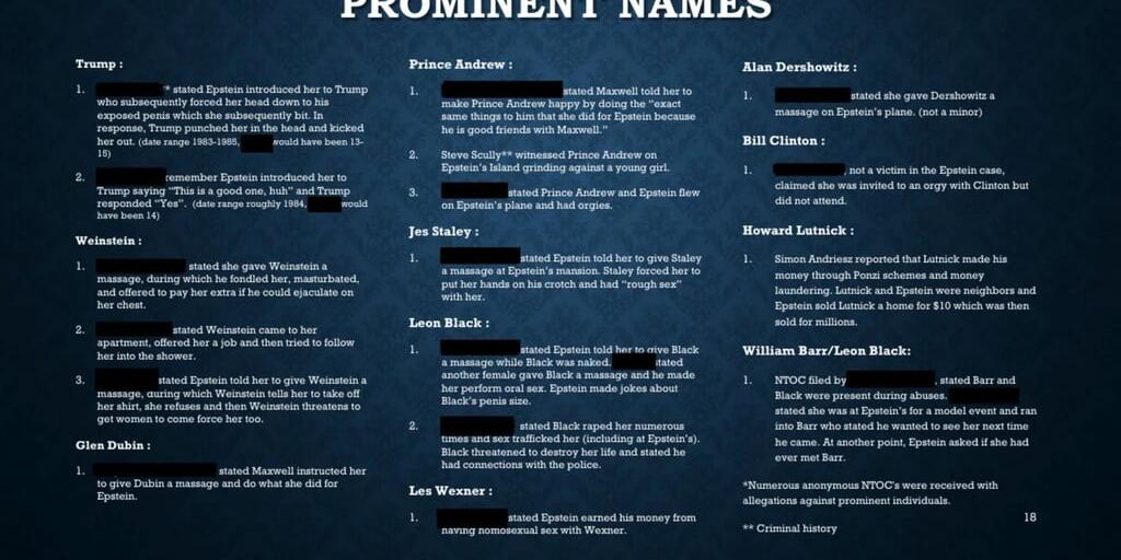 «[GESCHWÄRZT] gab an, dass Epstein sie Trump vorgestellt habe, der daraufhin ihren Kopf zu seinem entblössten Penis drückte, woraufhin sie ihn biss [...] Als Reaktion darauf schlug Trump ihr gegen den Kopf und warf sie hinaus.» Das Opfer war laut der Präsentation «zum Zeitpunkt des Vorfalls etwa 13 bis 15 Jahre alt». Der mutmassliche Übergriff ereignete sich Mitte der 1980er Jahre.