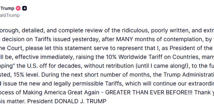 Hintergrund ist ein Urteil des Supreme Court, der Trump untersagte, Zölle unter Berufung auf ein Notstandsgesetz von 1977 zu verhängen. Dennoch kündigte der Präsident einen weltweiten Zollsatz von zunächst 10 und später 15 Prozent auf Importe in die USA an. Seine aggressive Zollpolitik gilt als zentrales Element seiner zweiten Amtszeit. Trump will nun auf ein Handelsgesetz von 1974 zurückgreifen, das zeitlich befristete Zölle erlaubt – ob die Voraussetzungen dafür erfüllt sind, ist unter Experten umstritten.