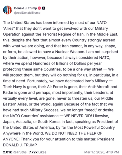 Trump möchte im Iran-Krieg doch keine Hilfe mehr durch die Nato-Länder. Das schreibt er auf seiner Plattform Truth Social.
