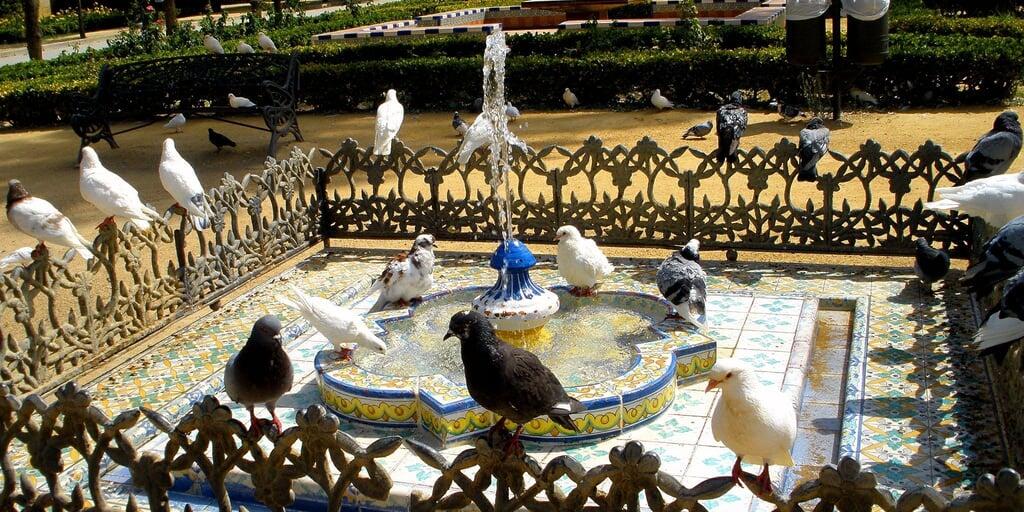 Vögel an einem Brunnen im Park María Luisa in Sevilla.
