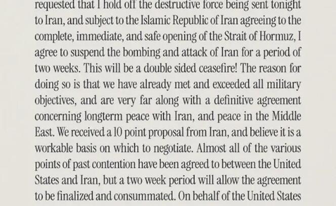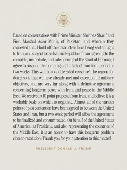 Den 10-Punkte-Plan mit Bedingungen, den der Iran den USA kürzlich zugestellt hatte und den Trump zunächst als ungenügend darstellte, nannte er nun eine «tragfähige Verhandlungsgrundlage». Die meisten Streitpunkte zwischen den USA und dem Iran seien geklärt. Innerhalb der nächsten zwei Wochen soll ein endgültiges Abkommen ausgearbeitet und abgeschlossen werden.