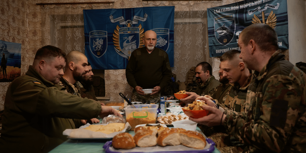 Ukrainische Marineinfanteristen beim Weihnachtsessen.