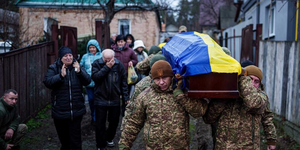 Trauernde Angehörige und Kameraden tragen in Hostomel einen gefallenen ukrainischen Soldaten zu Grabe - ob auch damit jemand Wettgelder eingestrichen hat?