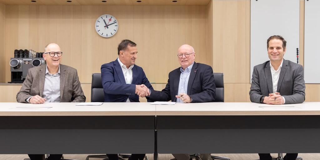 SBB-Chef Vincent Ducrot (zweiter von rechts) und der Schweiz-Chef von Hitachi Rail, Kurt Sauerwein, besiegeln den Deal - gemeinsam mit dem SBB-Personenverkehrschef Linus Looser (ganz rechts).