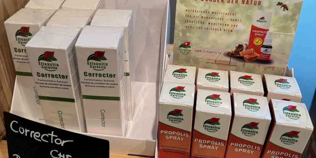 So werden die Elixavita-Produkte in Post-Filialen beworben. Auf der Kartonbox-, in der sich die Artikel befinden, ist das Schweizerkreuz auf dem Firmenlogo zu sehen. Auf den einzelnen Verpackungen nicht.