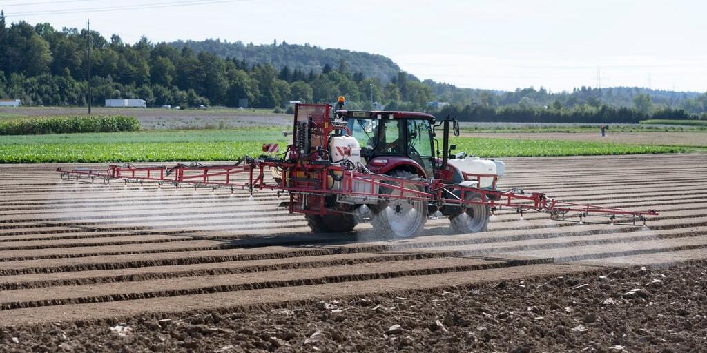 Ein Bauer bringt in Birmenstorf Pflanzenschutzmittel aus.