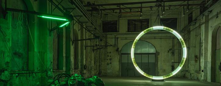 Davide Allieri transformiert die historische Halle mit einer künstlichen Licht- und Klangatmosphäre in eine begehbare Science-Fiction-Landschaft.