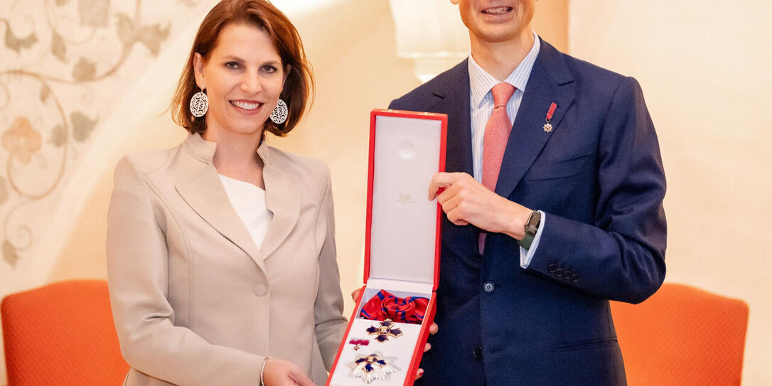 Karoline Edtstadler wird von Erbprinz Alois mit dem Grosskreuz ausgezeichnet.