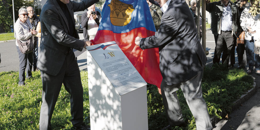 Honorarkonsul Alexander Ospelt (l.) und Joseph Guiot, Vizepräsident des Vereins «Die Freunde Liechtensteins in Wallonien», enthüllten gestern Vormittag bei der Hofkellerei in Vaduz die neue Gedenktafel.