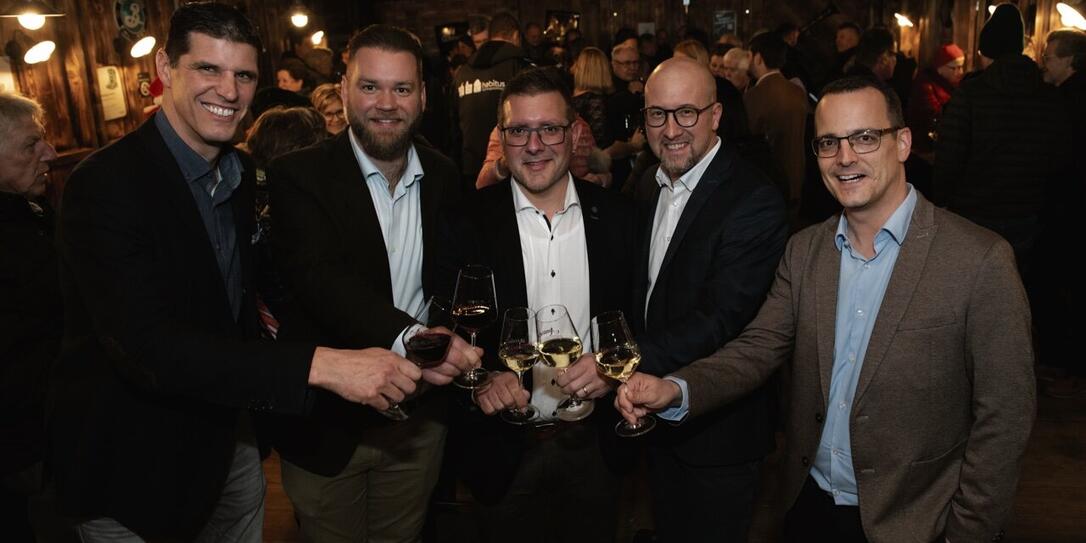 Thomas Ott, Martin Reich, Andreas Gerner, Hanno Hasler und Vorsteher Tino Quaderer stossen auf die erfolgreiche Eröffnung an.